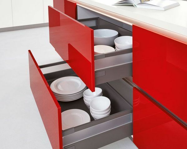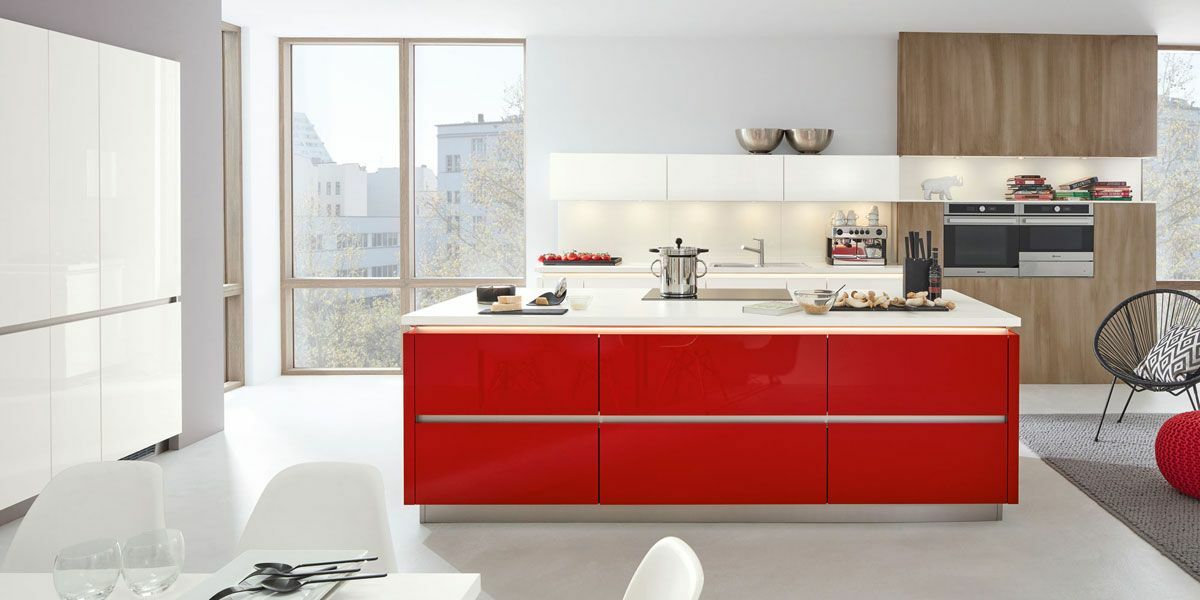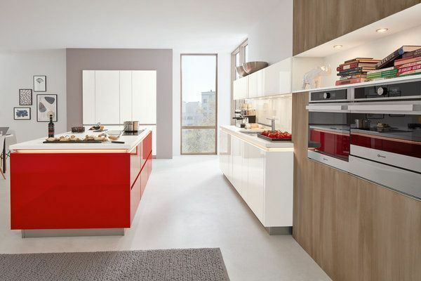 在這裡,廚房中島呈現出鮮紅色、高光澤度,作為一個功能性的中心裝飾品,