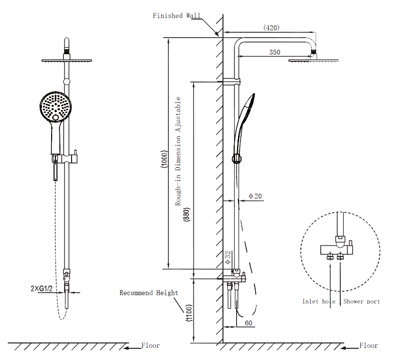 1.5mPVC銀色花灑軟管和0.7m 連接管,搭配七字銅管(不可升降)
